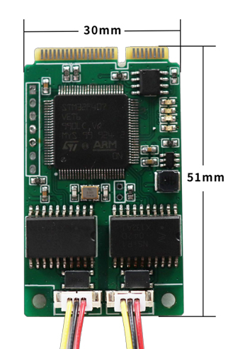 USBCAN-ME接口卡集成1路PCIE接口、2路标准CAN-bus接口。CAN-bus接口由3 Pin的1.25插拔式接线端子引出,可以用于连接2个CAN-bus网络或者CAN-bus接口的设备。CAN-bus接口、PCIE接口如图2.2所示,接口定义如表2.2所示。