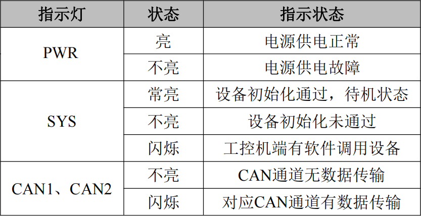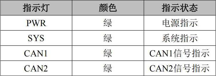 USBCAN-ME模块具有1个PWR指示灯、1个SYS指示灯、1个CAN1指示灯、1个CAN2指示灯来指示设备的运行状态。这4个指示灯的具体指示功能见表3.1,这4个指示灯处于各种状态下时,CAN总线的状态如表3.2所示。