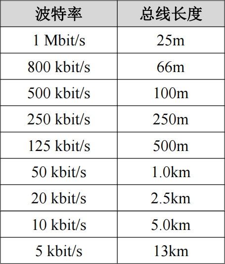 请注意:CAN-bus电缆可以使用普通双绞线、屏蔽双绞线。理论最大通信距离主要取决于总线波特率,最大总线长度和波特率关系详见表3.3。若通讯距离超过1km,应保证线的截面积大于Φ1.0mm2,具体规格应根据距离而定,常规是随距离的加长而适当加大。