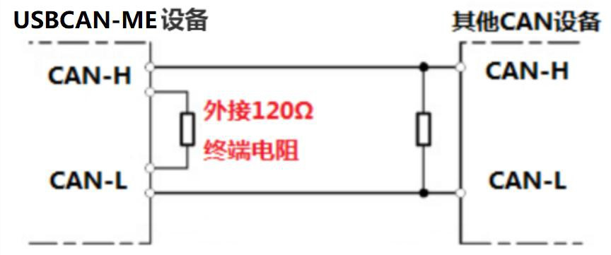请注意:USBCAN-ME模块内部默认未集成120Ω终端电阻。如果节点数目大于2,中间节点需要安装120Ω的终端电阻。需要使用时,可以联系销售选装电阻,或将电阻两端分别接入CAN_H、CAN_L即可,如图3.2所示。