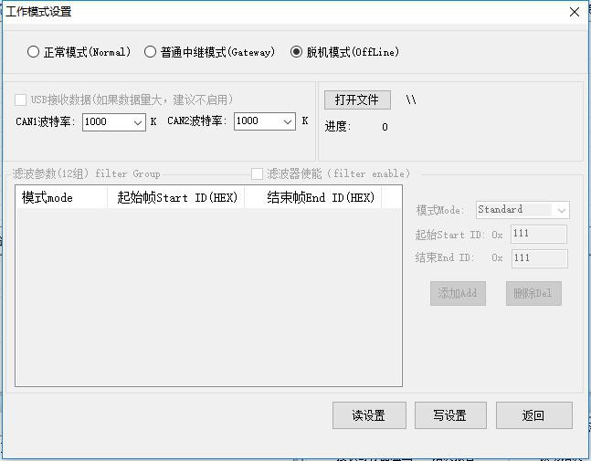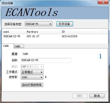 请注意,设置波特率尤其重要,许多客户反映设备连接上之后没有数据,或总线错误,实为波特率没有设置就直接点击确定打开设备。在这里提示您,无论您将我们的设备作为主或从设备使用,只要您将设备接入到CAN总线上,必须将设备的波特率设置成与目标设备波特率一致,才可以正常工作。