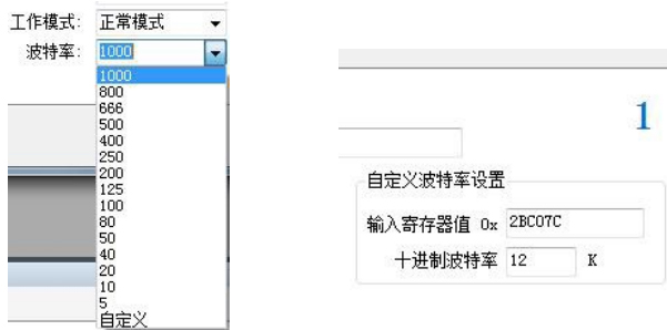 选中设备后,在下边可以设置一些具体的工作模式和波特率。如您购买的是双通道设备,可通过选项卡分别对CAN1、CAN2进行设置,设置波特率尤为重要,此处设置波特率不可以手动输入,需要通过下拉菜单选择,我公司产品支持如图所示标准波特率:
