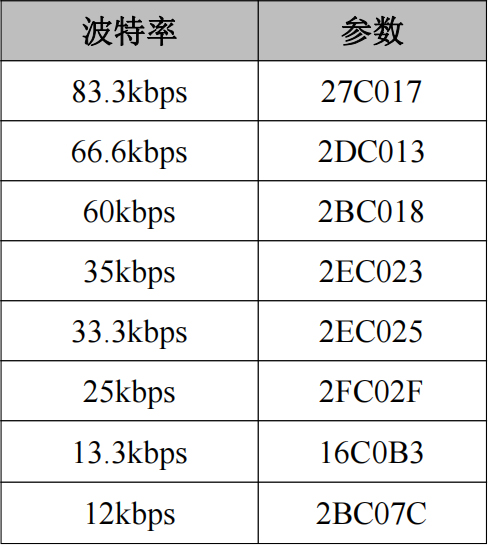 如您使用的是特殊波特率,请点击自定义按钮,此时需要您输入一个十六进制码,下表中列出了部分特殊波特率的值,如您需要其他波特率请联系我们,我们会帮您计算寄存器设置值。