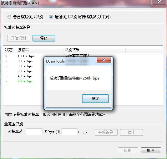 如果标准波特率识别不到未知节点的波特率,可使用全范围波特率进行进一步识别。本功能有助于帮助工程师修正新开发设备的波特率偏差。