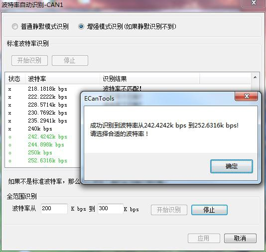 请注意,对于汽车的CAN总线系统,请选择“普通静默模式识别”来识别波特率。使用“增强模式识别”可能会造成车辆仪表报错。