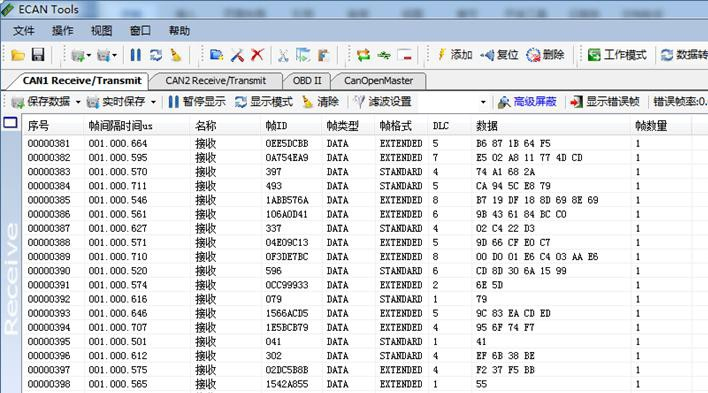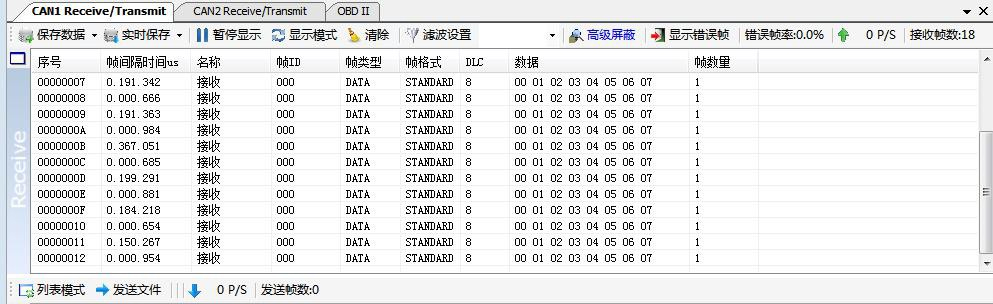 设备参数设置好后,软件就进入工作状态,如果总线上有数据,这时接收数据窗口就会有数据显示。接收窗口如下图所示: