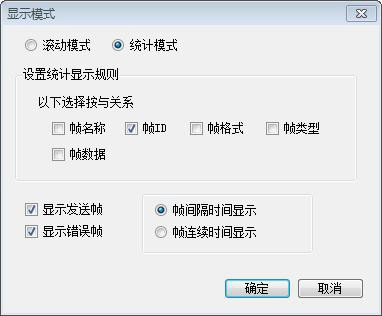滚动显示是接收到的数据在接收列表中不停的向下滚动,当前窗口看到的是最新的数据;统计列表方式是按设置好的规则分类显示,如可设置同一ID的数据包显示统计在一起,后面有统计包数量。统计模式可方便工程师抓取总线上新产生的或有变化的数据。