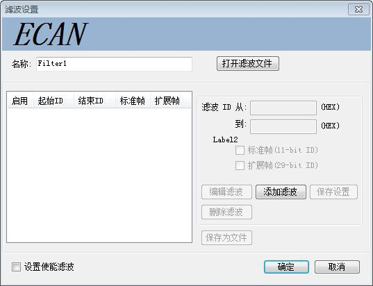 接收滤波设置可设置滤波ID或ID段,如设置滤波,软件会只显示被设置的滤波ID(段),不在滤波范围内的ID将会被过滤掉。点击“编辑滤波”,弹出滤波设置窗口,可以设置滤波范围: