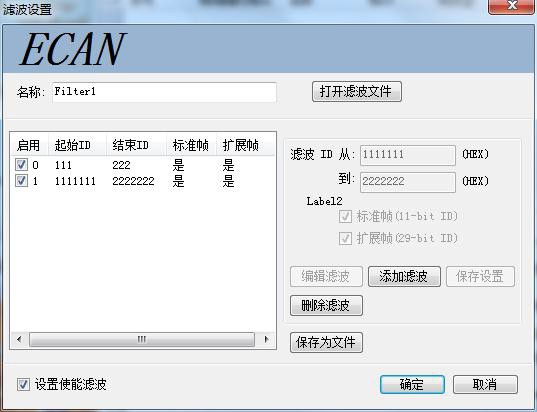 点击“添加滤波”即可开始编辑,输入想要过滤显示的ID或ID段后点击“保存设置”即可将滤波内容添加到的左侧。