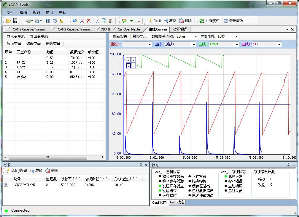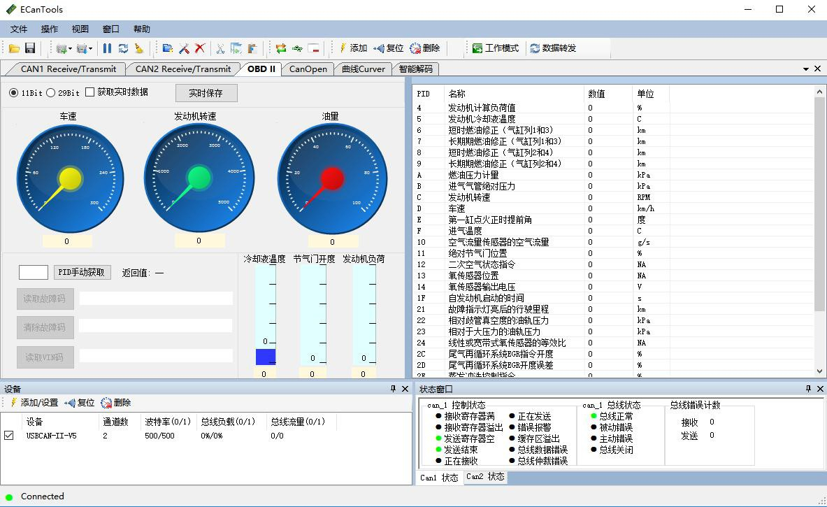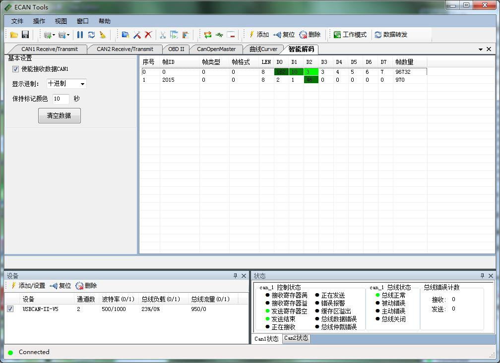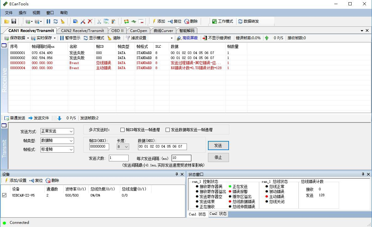 USBCAN-ME接口卡可使用我公司自主开发的ECANTools通用测试软件,可执行CAN-bus报文的收发和监测等功能。
