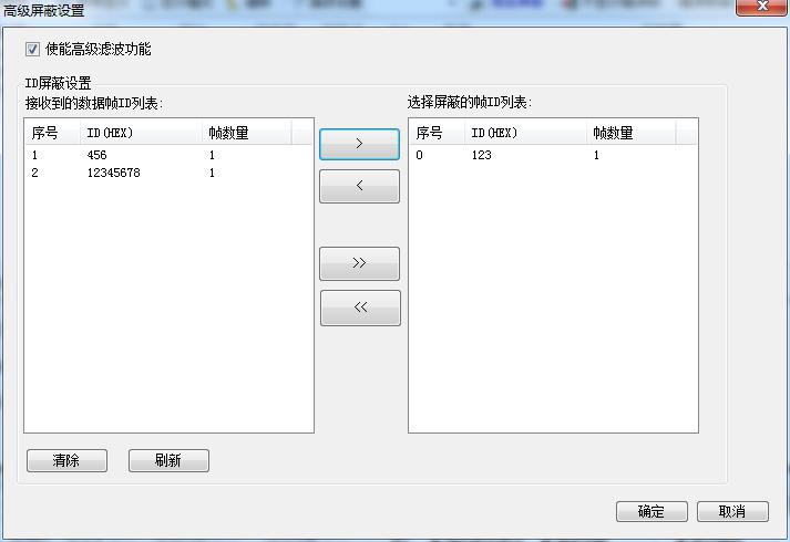 ECANTools软件可以屏蔽接收到的指定的CAN帧数据。ECANTools软件可以将接收到的数据按帧ID归类后合并显示在左侧的待屏蔽列表中,从左边的列表中您可以选择需要屏蔽的帧ID,点击向右箭头即可将选中的帧ID添加到屏蔽列表中,软件将自动屏蔽右侧列表中所有以此帧ID开头的所有数据,屏蔽列表可以设置多条屏蔽帧ID,注意勾选使能滤波。