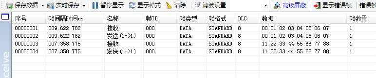 ①CAN1接收的数据-CAN1发送:CAN1收到数据立即从CAN1发出,相当于数据反射功能。