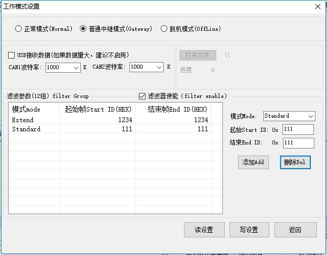 ③CAN2接收的数据-CAN1发送:CAN2通道收到数据后经过滤波将这条数据从CAN1通道发出,此处CAN1和CAN2通道可设置不同波特率。