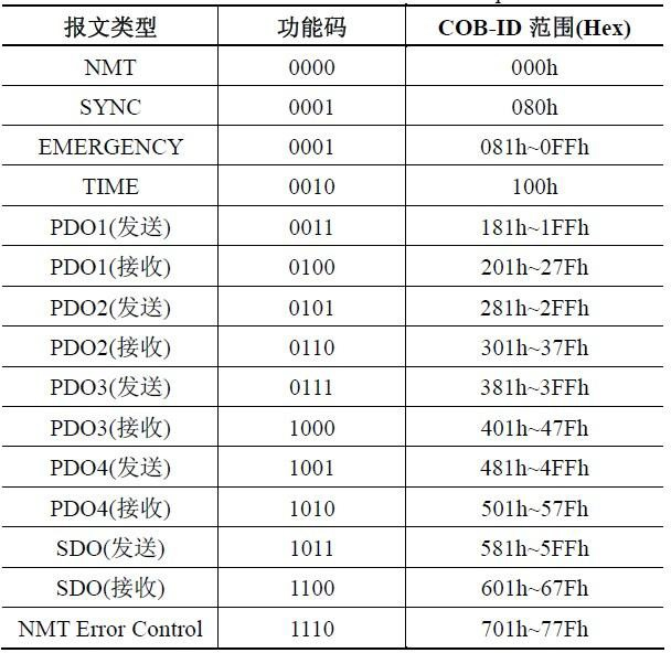 下表列出了CANopen常见报文类型所对应的功能码及帧ID范围。