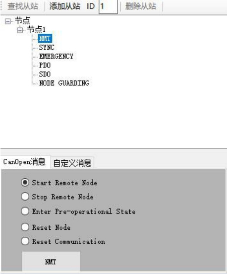 NMT命令(Network Management)提供网络管理(如初始化、启动和停止节点,侦测失效节点)服务。这种服务是采用主从通讯模式(所以只有一个NMT主节点)来实现的。
