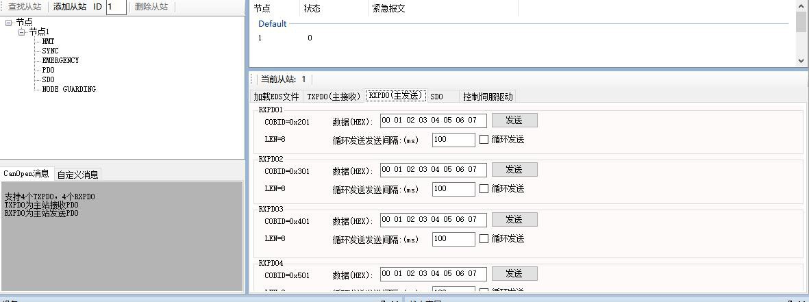 用户可通过ECANTools软件循环发送SYNC报文,所有的同步PDO会根据SYNC报文发送。