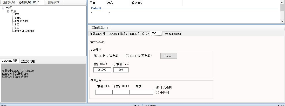CANopen主站模块的SDO功能分为发送SDO和接收SDO,用于读写对象字典。SDO为服务数据对象,英文全称Service data object,有指定被接收节点的地址(Node ID),并且需要指定的接收节点回应CAN报文来确认已经接收,如果超时没有确认,则发送节点将会重新发送原报文。这种通讯方式属于常见的“服务器客户端”的通信模型,即我们常说的轮询式。