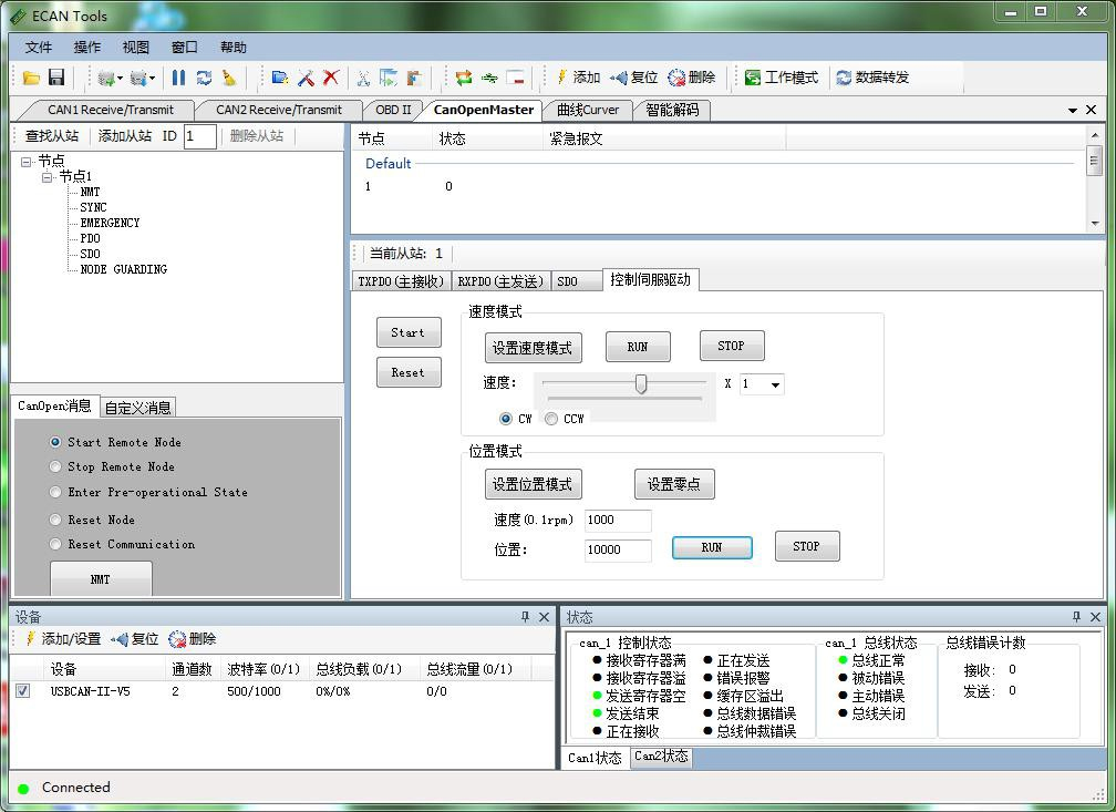 ECANTools软件的CANopen主站功能可将USBCAN设备变成一个CANopen主站卡接入CANopen网络中,使用电脑搭配USBCAN即可完成对CANopen从站控制、管理、配置等应用。ECANTools软件可完成多种常用CANopen主站功能,如NMT(网络管理)、SYNC(同步协议)、EMERGENCY(紧急报文)、PDO(过程数据对象)、SDO(服务数据对象)、NODE GUARDING(节点保护)。