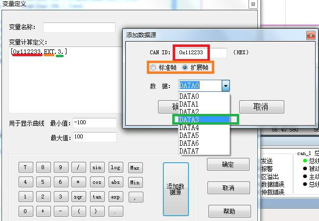 “添加数据源”就是将收到的CAN总线原始数据中某一帧的某一字节的数据作为数据源添加到变量计算定义中,添加时先点击“添加数据源”,然后依次填充“CAN ID”、“标准帧(扩展帧)”、“数据”等信息,点击确定,会在“变量计算定义”中生成一条相应的语句,该语句也可自行编写,编写时请遵循该格式。