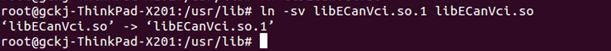 5.进入gcc编译库文件夹,把libECanVci.so.1和libECanVci.so链接到一起。输入:ln-sv libECanVci.so.1 libECanVci.so