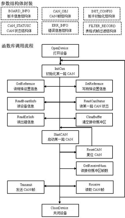 我公司为二次开发的用户提供标准的接口函数库,包括:ECANVCI.h、ECANVCI.lib、ECANVCI.dll。该接口函数库均为标准格式,用户可以在VC、VB、Labview等编程环境中,对这些接口函数声明调用,具体使用方法详见“EcanVCI动态库使用手册”。图6.1为常用结构体名称及函数库调用流程。