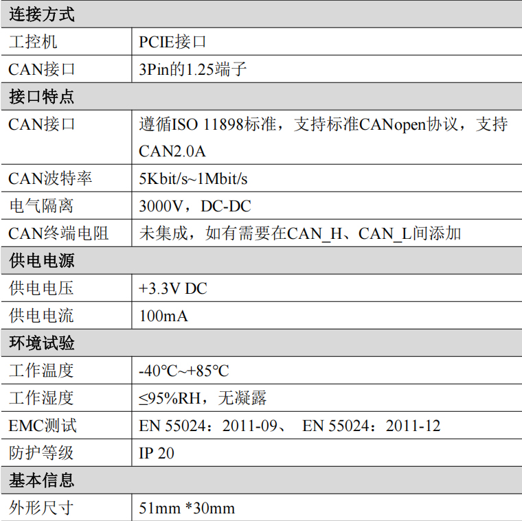 - (1)PCIE接口;(2)支持CAN2.0A和CAN2.0B帧格式,符合ISO 11898规范;(3)集成2路CAN-bus接口,使用3Pin端子接线方式;(4)CAN-bus通讯波特率在5Kbps~1Mbps之间任意可编程;(5)电气隔离,隔离模块绝缘电压:DC 3000V;(6)支持Windows XP、7、8、10等Windows操作系统;(7)支持Linux操作系统;(8)支持ECANTools测试软件;(9)支持二次开发;(10)工作温度范围:-40℃~+85℃。