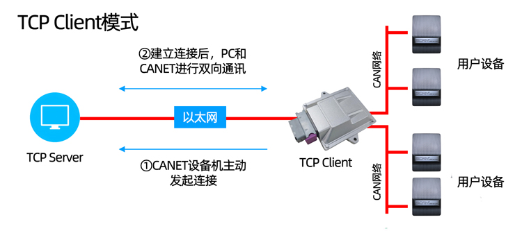 在TCP客户端(TCP Client)模式下,GCAN-212-W将主动与预先设定好的TCP服务器连接。如果连接不成功,客户端将会根据设置的连接条件不断尝试与TCP服务器建立连接。在与TCP服务器端建立TCP连接后即可进行双向数据通信。建立通讯的过程如图3.4所示。