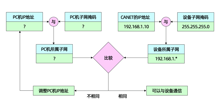 GCAN-212-W设备在出厂时设定了一个默认的IP地址(192.168.1.10)和网关(255.255.255.0),用户可以按图3.2所示的流程检查该设备是否和用户PC机在同一网段。