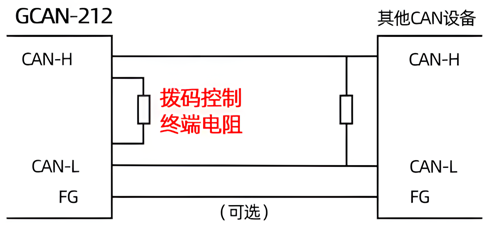 注意:广成科技GCAN-212-W内部未集成120Ω终端电阻,可通过自己接线是否将电阻接入总线。