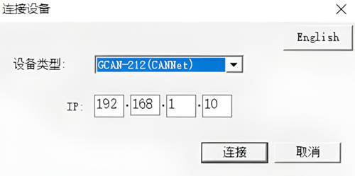 插入网线后,打开CANet-Wifi-Config-V5软件,选择CANet设备,输入IP地址:192.168.1.10(这个IP地址是固定的,不能修改)连接设备。