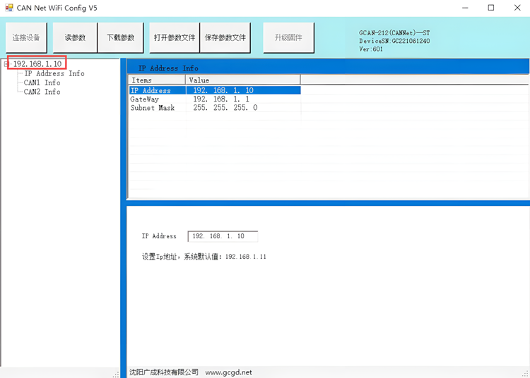系统默认的IP:192.168.1.10,默认的CAN总线波特率是250K。