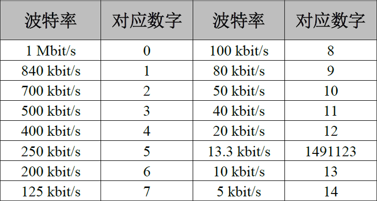 表3.1波特率与最大总线长度参照表
