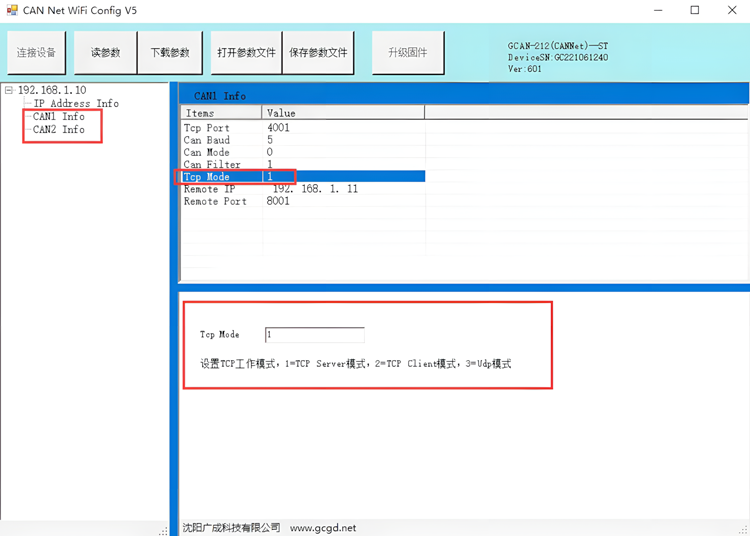 10 00 00 08 01 02 04 01 00 01 00 00 00可设置CAN1的以太网工作模式为