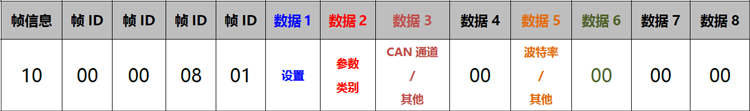 数据1,数据2:02 01表示设置波特率;0B 03表示CAN1-CAN2复位。数据3:01表示CAN1通道;02表示CAN2通道。