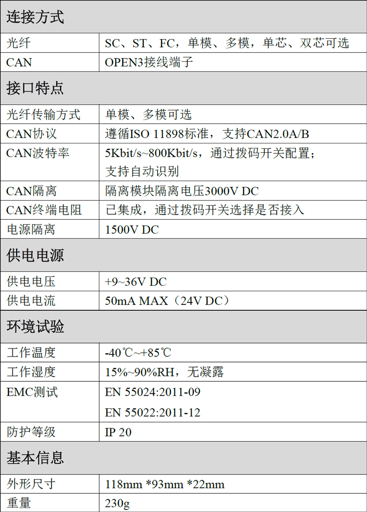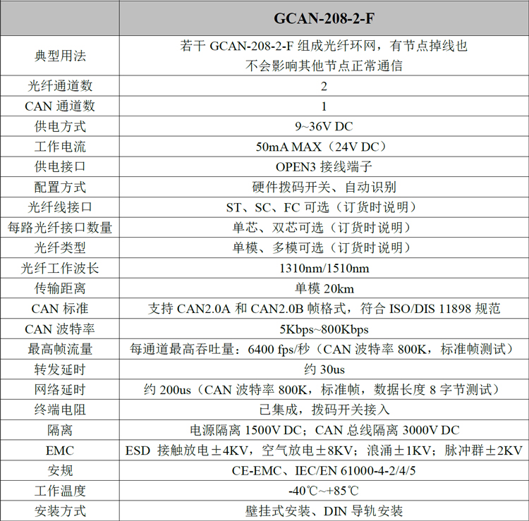 2)GCAN-208-2-F系列光纤支持CAN总线网络的中继扩容,传输距离20km;支持不同波特率的CAN总线网络,CAN波特率支持5Kbps~800Kbps;支持CANopen、SAE J1939、DeviceNet、NMEA2000等任何CAN总线通信协议。
