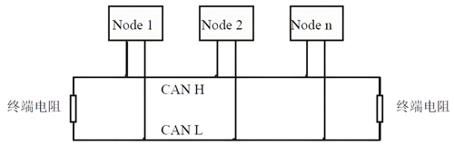 CAN总线网络采用直线拓扑结构,总线最远的2个终端需要安装120Ω的终端电阻;如果节点数目大于2,中间节点不需要安装120Ω的终端电阻。对于分支连接,其长度不应超过3米。CAN总线总线的连接见图3.7所示。