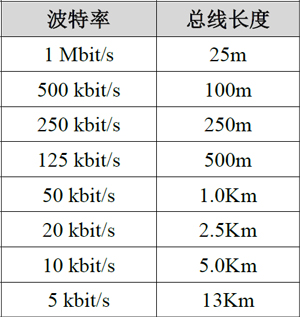 请注意:CAN总线电缆可以使用普通双绞线、屏蔽双绞线。理论最大通信距离主要取决于总线波特率,最大总线长度和波特率关系详见表3.2。若通讯距离超过1Km,应保证线的截面积大于Φ1.0mm2,具体规格应根据距离而定,常规是随距离的加长而适当加大。