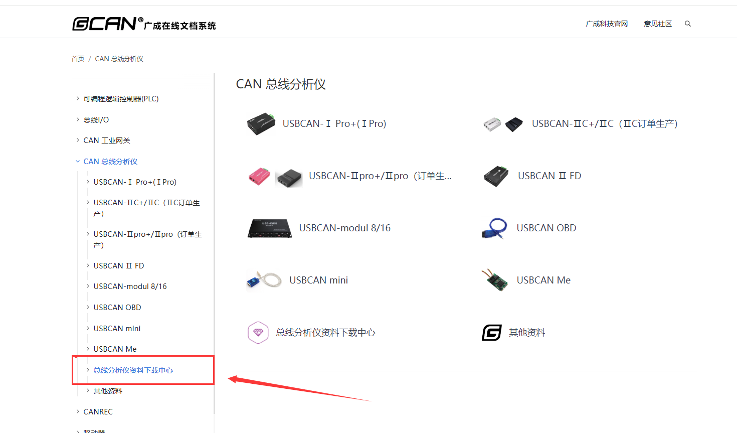进入“CAN分析仪”选项后,找到“总线分析仪资料下载中心”,并进入