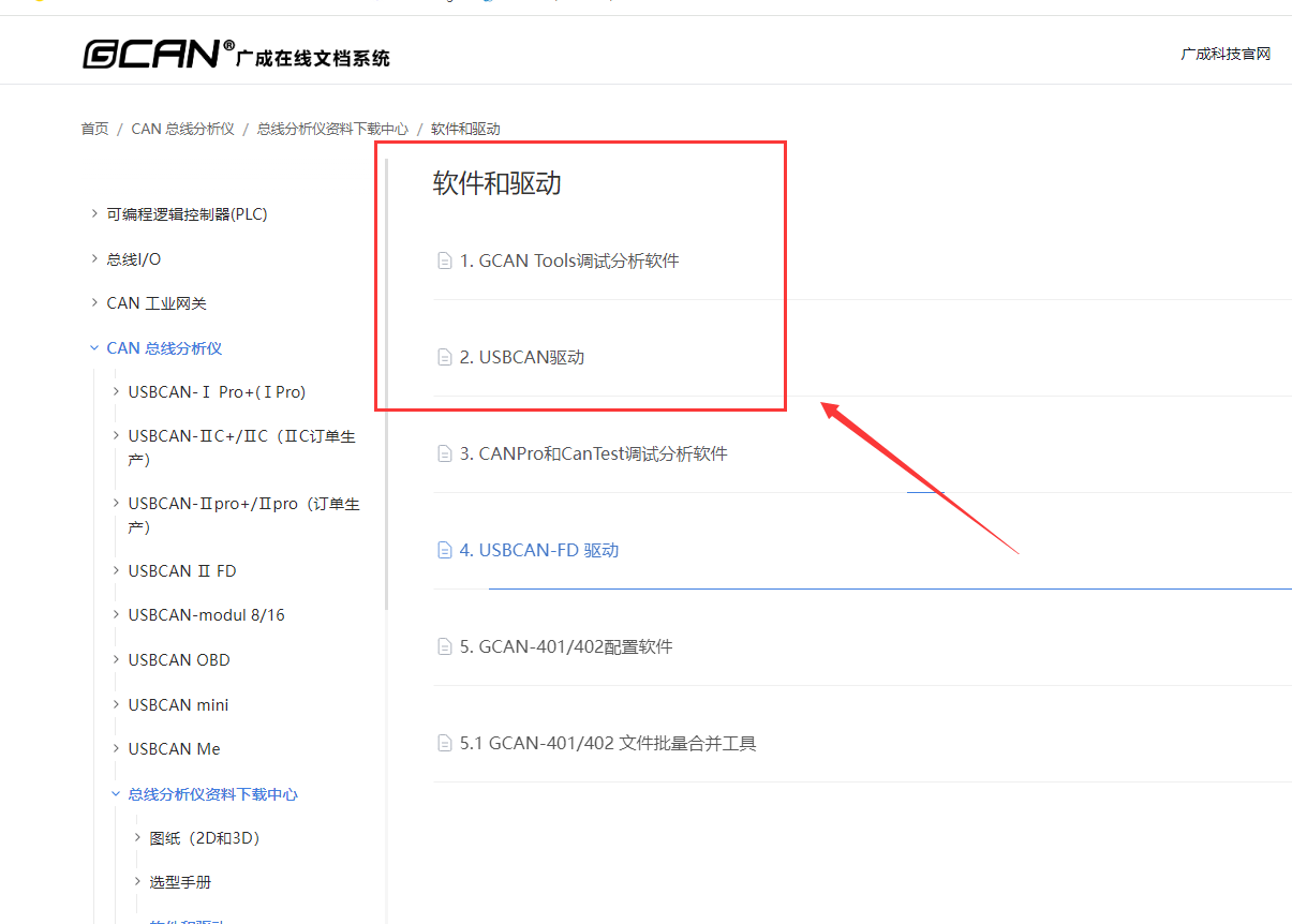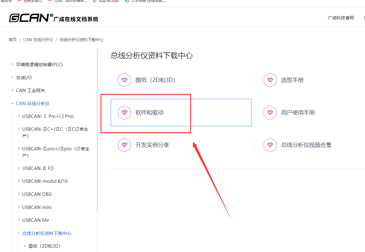 点击进入之后,找到“软件和驱动”选项,在里面尽可以下载各种CAN盒上位机软件和驱动了,我们的驱动和软件对广成CAN分析仪都是通用的,可以放心下载使用。