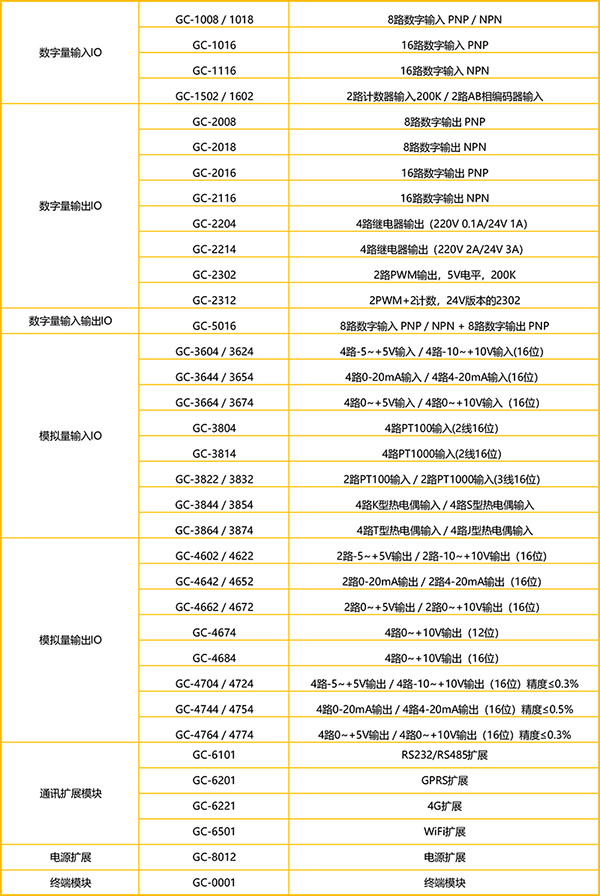 (2)支持IO接口扩展,扩展IO类型包括各种数字量模拟量输入输出IO(下图表格部分展示)。最高可扩展数量达到512个。