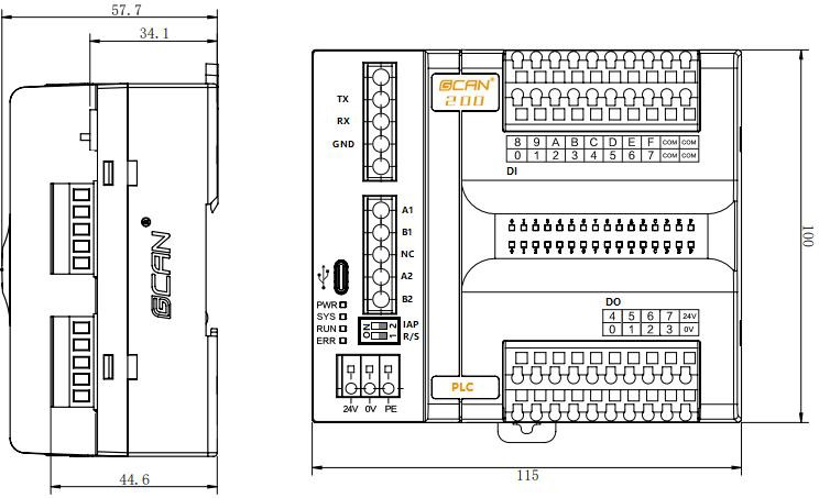 GCAN-PLC-200外观如图2.1所示,(长)115mm*(宽)100mm*(高)58mm。