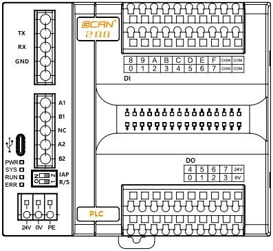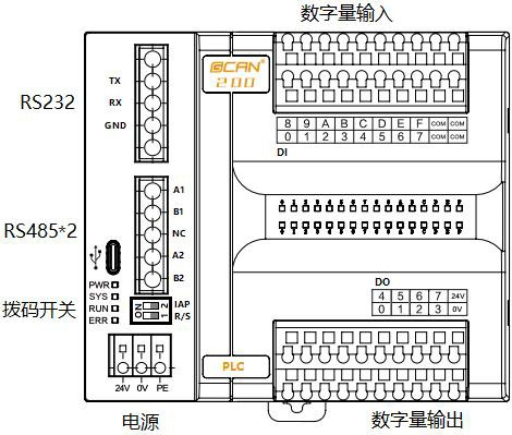 - GCAN-PLC-200是一款集成有总线控制功能的可编程逻辑控制器(PLC)。其不仅具有外观简约、高性价比的特点,还可以方便的连接入Modbus系统等。