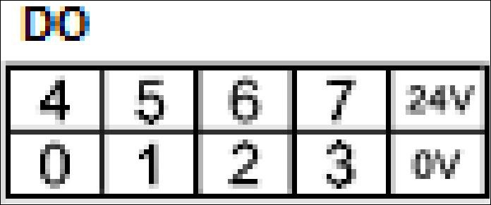 GCAN-PLC-200的主控模块右侧顶板含有上下四排端子排,下方两排端子排的右侧为DO端子排,分别为DO0~DO7共8个数字量输出点,以及1组IO供电电源接口(IO供电电源已与系统电源隔离,IO模块需供电后才能正常工作),如图所示。各个端子对应的序号及其含义如表2.4所示。