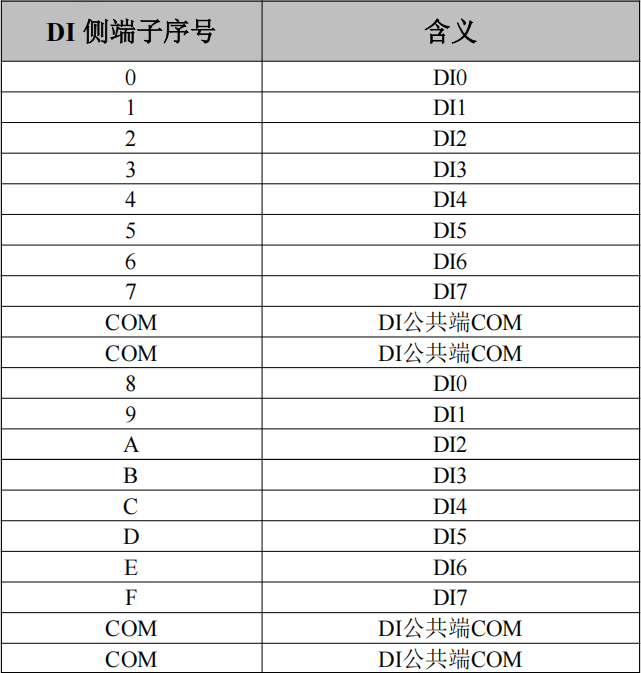 上方两排端子为DI端子排,分别为DI0~DI7,DI8~DIF共16个数字量输入点,以及4个DI的COM接口(4个COM口内部已短接,任意连接1个即可),如图所示。各个端子对应的序号及其含义如表2.5所示。