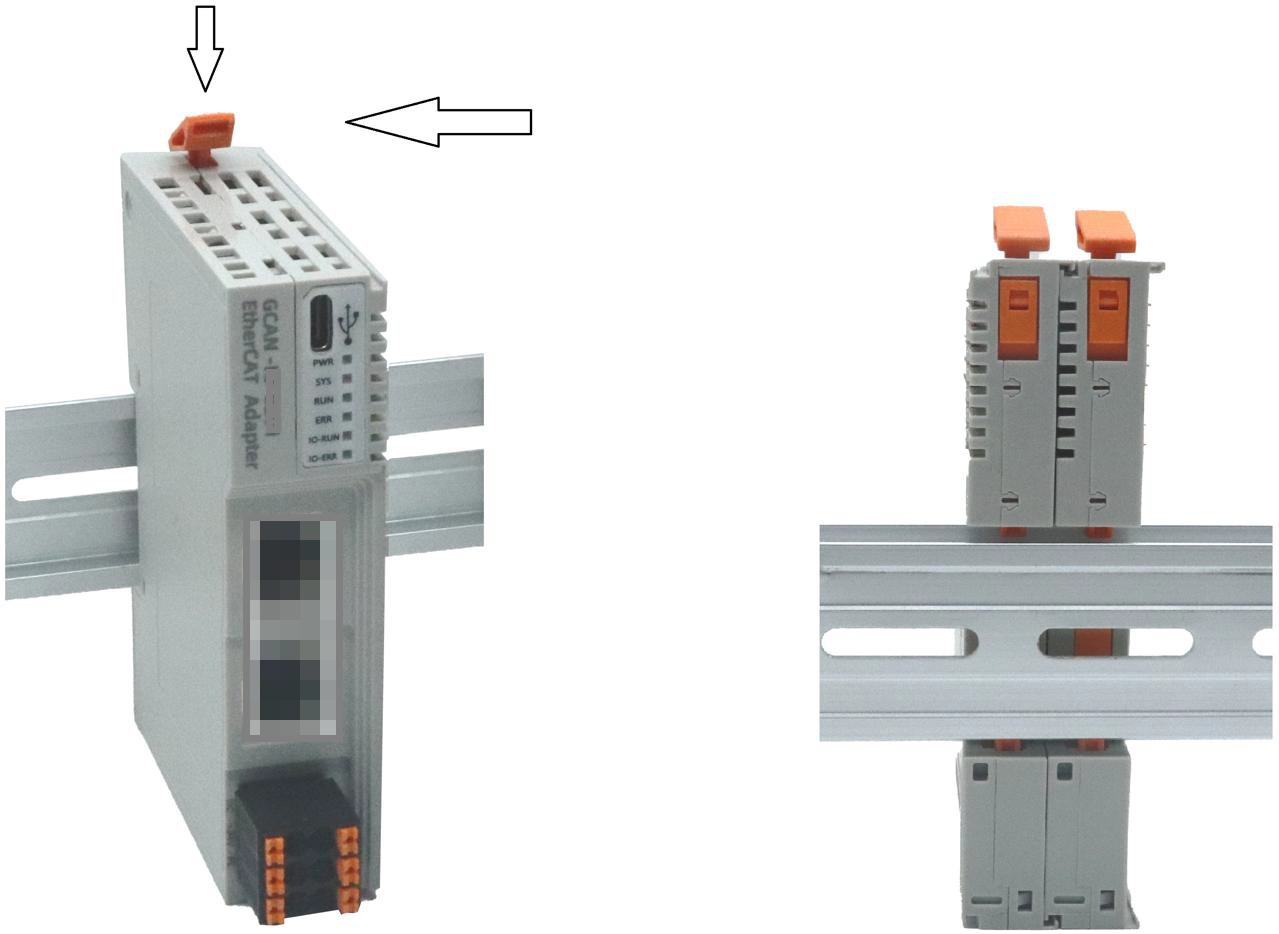 GCAN-PLC-325可编程逻辑控制器的锁定和解锁状态如图2.2所示。当模块未安装在导轨上时,请将导轨锁扣保持在锁定状态,如长时间处于解锁状态,可能会导致锁扣失效。