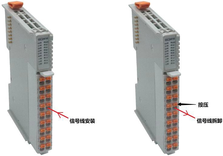 使用一字端子接头的线缆,将端子接头对准相应通道的圆孔插入即可;拆线时,需使用一字螺丝刀,插入需拆线的通道旁对应橘黄色方形孔,用力向下按压,此时相应圆孔中的夹片会松动,线缆即可轻松拔出。
