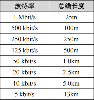 请注意:CAN-bus电缆可以使用普通双绞线、屏蔽双绞线。理论最大通信距离主要取决于总线波特率,最大总线长度和波特率关系详见表3.1。若通讯距离超过1km,应保证线的截面积大于Φ1.0mm2,具体规格应根据距离而定,常规是随距离的加长而适当加大。