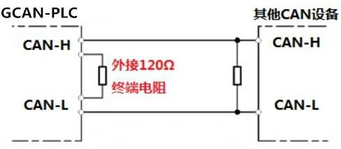 请注意:GCAN-PLC-325的CAN总线内部未集成120Ω终端电阻。如果节点数目大于2,中间节点不需要安装120Ω的终端电阻。需要使用时,将电阻两端分别接入CAN_H、CAN_L即可,如图3.2所示。