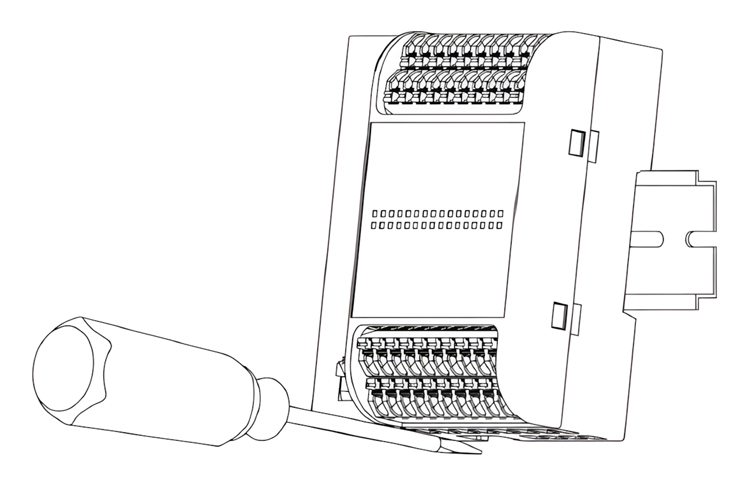 先将模块下方的导轨卡扣用一字螺丝刀拉出;然后将模块挂到DIN导轨上,并使用一字螺丝刀将下方的导轨卡扣推进去锁定,如图所示: