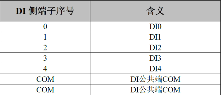 上方两排端子为DI端子排,分别为DI0~DI7,DI8~DIF共16个数字量输入点,以及4个DI的COM接口(4个COM口内部已短接,任意连接1个即可),如图所示。各个端子对应的序号及其含义如表2.5所示。